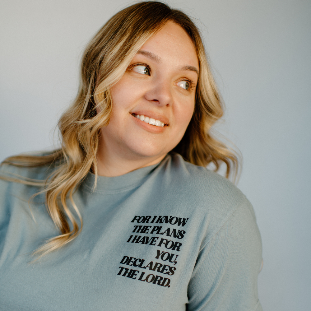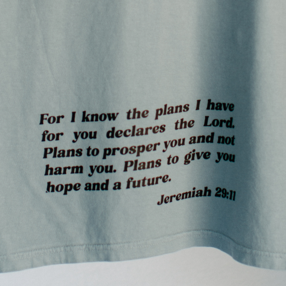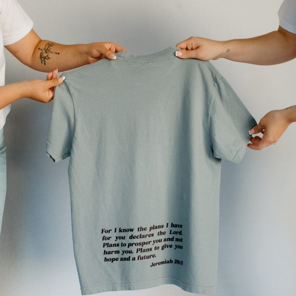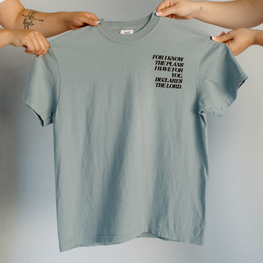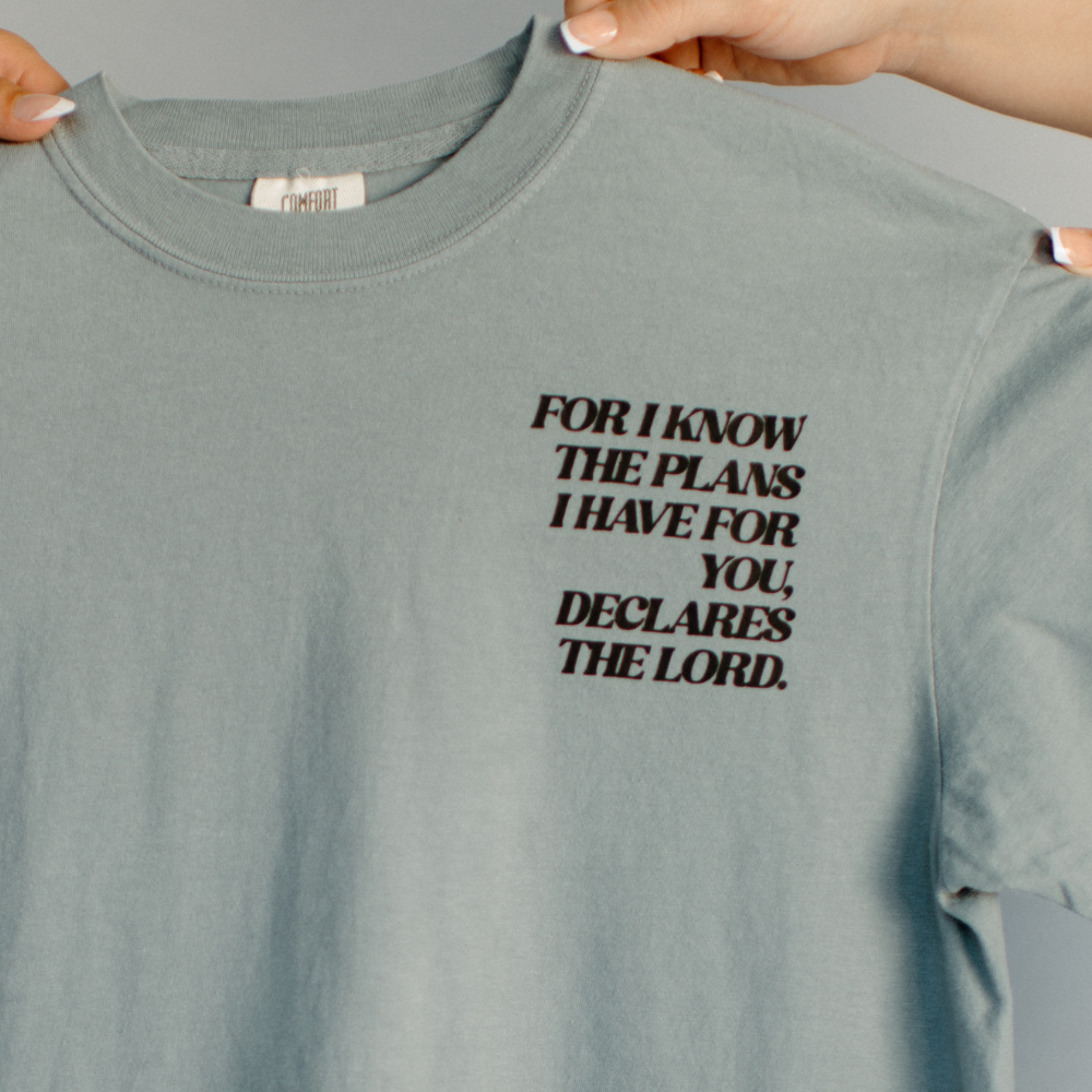 Get inspired with The Plans I Have tee, featuring a front pocket design that reminds us of God's plans for our lives. With the empowering scripture of Jeremiah 29:11 on the back, this tee will be a daily reminder of His loving guidance. Make a statement of faith with this casual and supportive design.