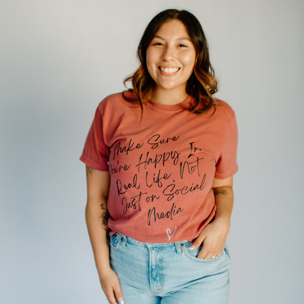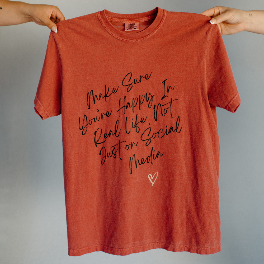 Stay grounded and true to yourself with our thought-provoking tee featuring the phrase "Make sure you're happy in real life, not just on social media."
