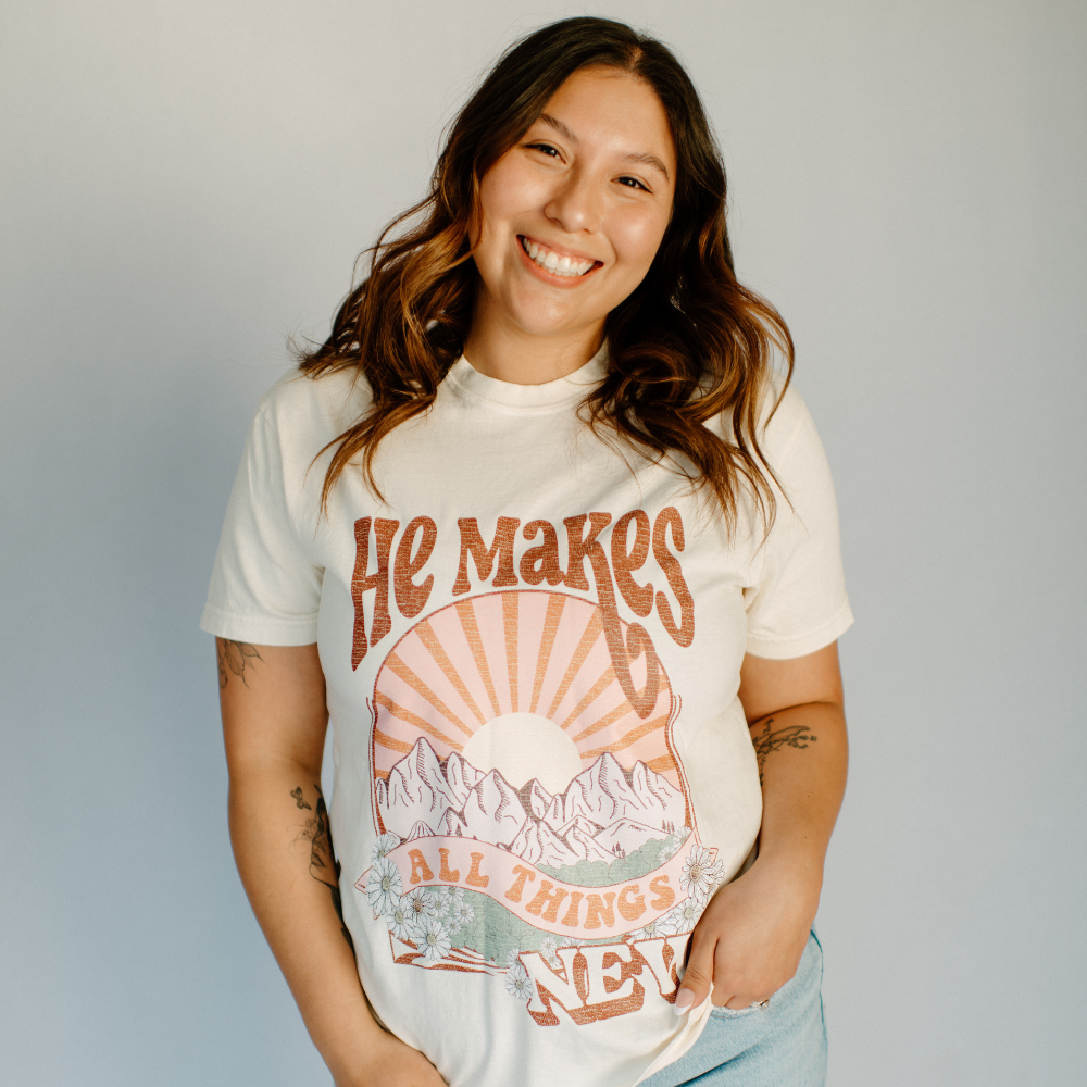 Celebrate the power of renewal and faith with our inspiring tee featuring the uplifting message "He makes all things new."