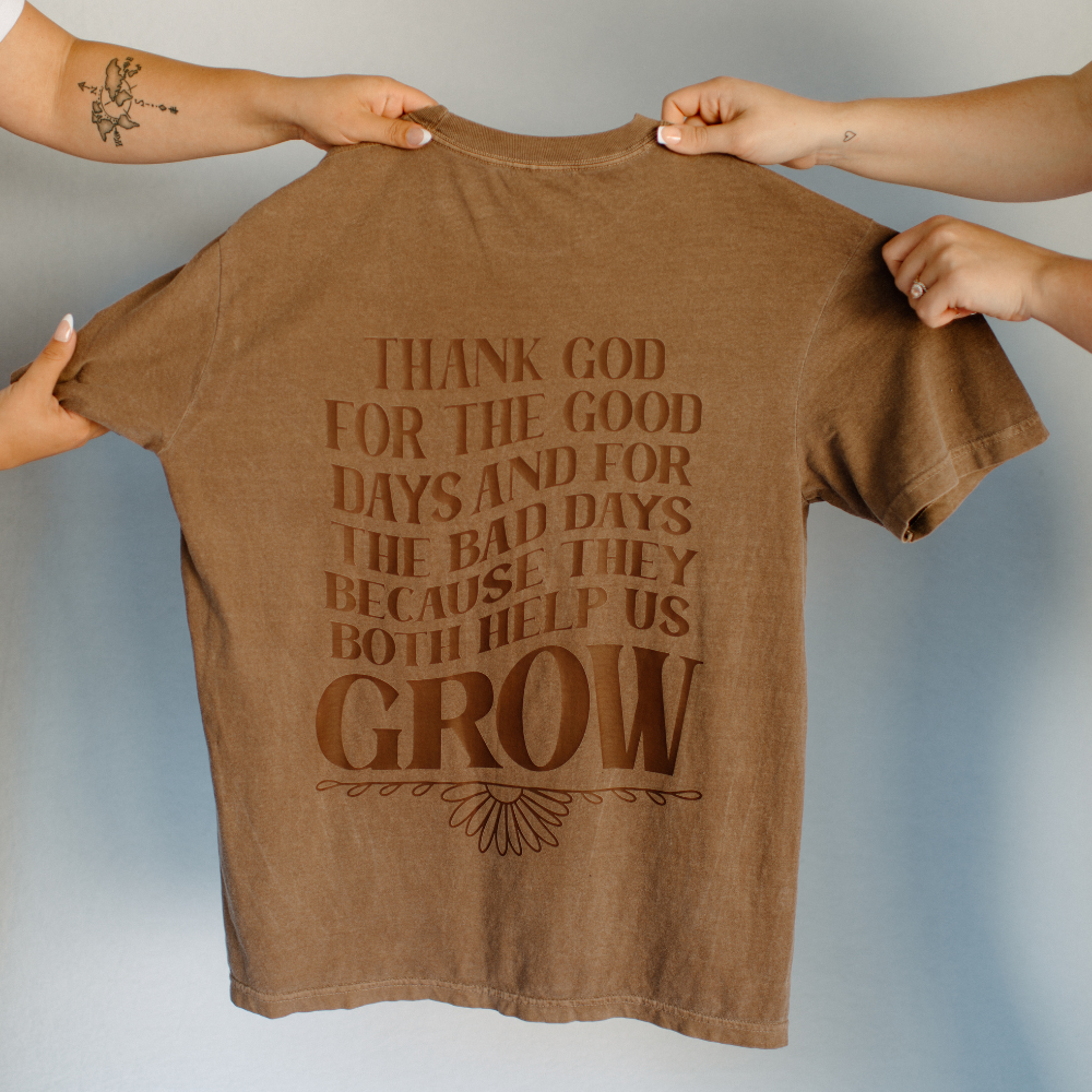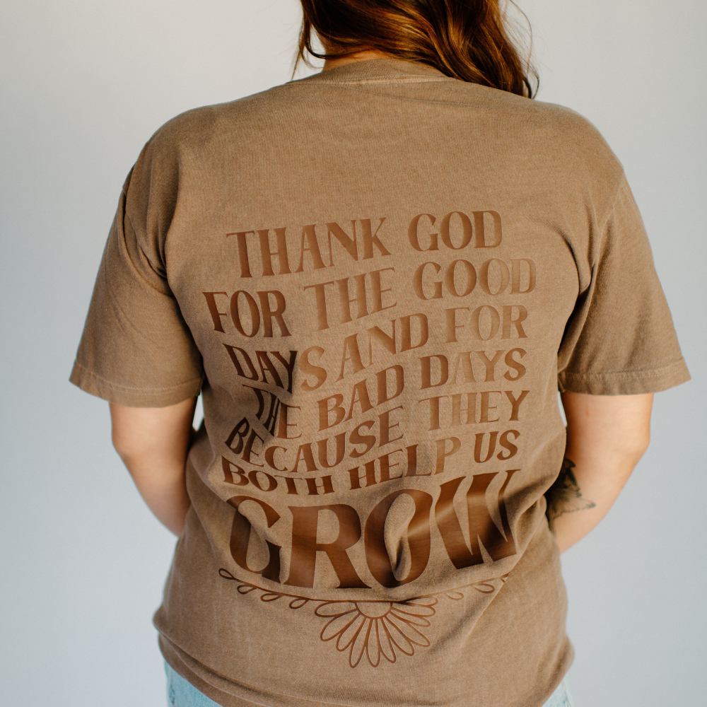Embrace every step of your journey with our heartfelt tee, adorned with a delicate, growing flower on the top left corner and a powerful message on the back: "Thank God for the good days and the bad days because they both help us grow."