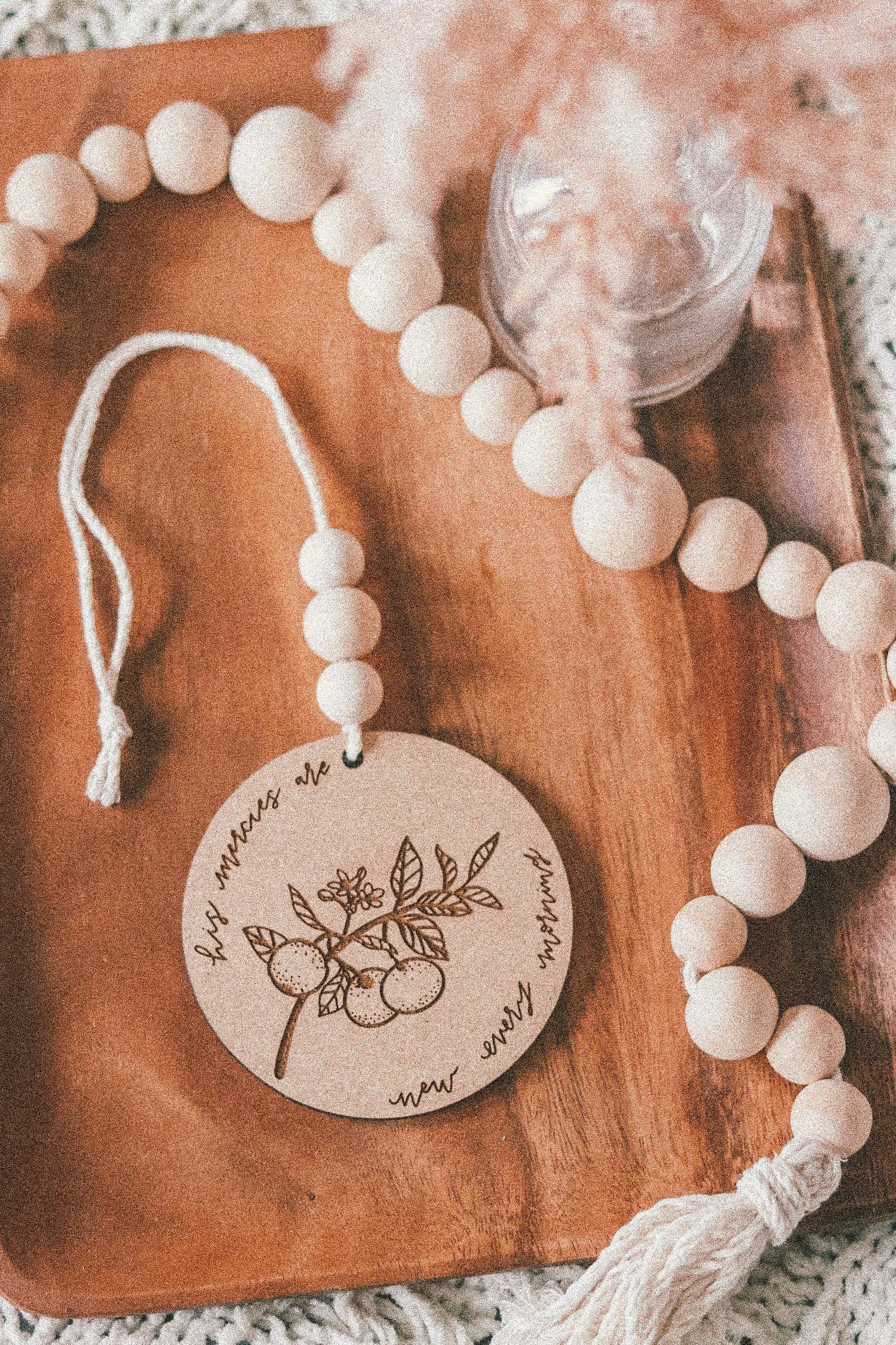Bring a touch of faith and encouragement to your everyday drive. This hand-lettered, laser-engraved car charm features the beautiful reminder “His mercies are new every morning” surrounded by delicate floral details. Paired with natural wooden beads and an adjustable string, it hangs perfectly from any rearview mirror.