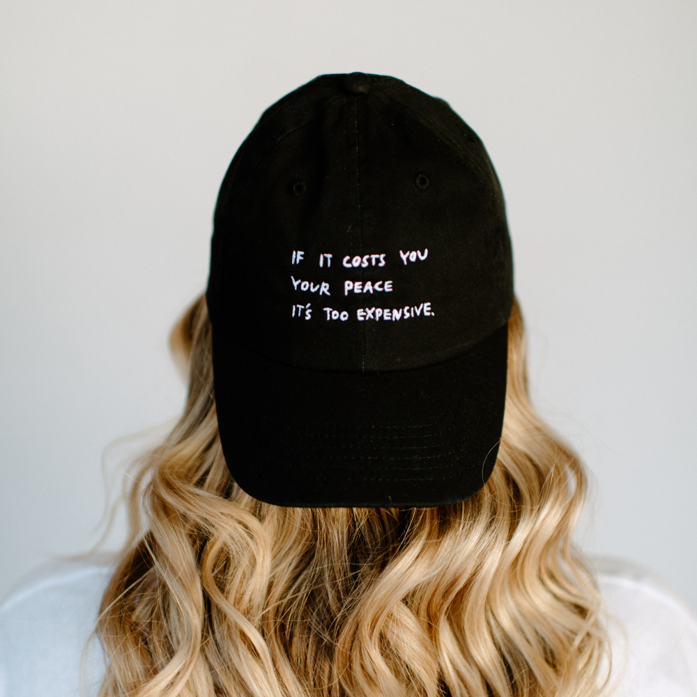 Keep the peace with our black adjustable cap featuring white embroidered script that reminds you: if it's costing you your peace, it's too expensive. With a focus on mental health and setting boundaries, this hat is a reminder to prioritize your well-being and find true happiness in a society that often values productivity over peace.