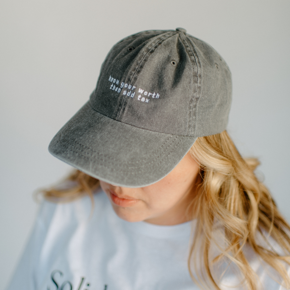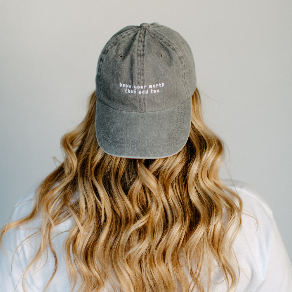 Upgrade your hat game with our Know Your Worth Cap. The grey cap features a white embroidered message that reads "know your worth, then add tax" - a daily reminder to prioritize your mental health and confidence. With an adjustable strap, this cap is perfect for anyone looking to make a statement and feel supported.