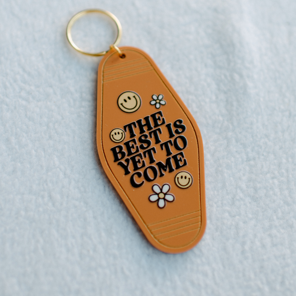 This keychain is more than just a place to hold your keys - it's a daily reminder that the best is always yet to come. With a playful rust color, bold black writing, and charming florals and smiley faces, it's the perfect dose of encouragement and perspective. Go ahead, add some optimistic charm to your life!