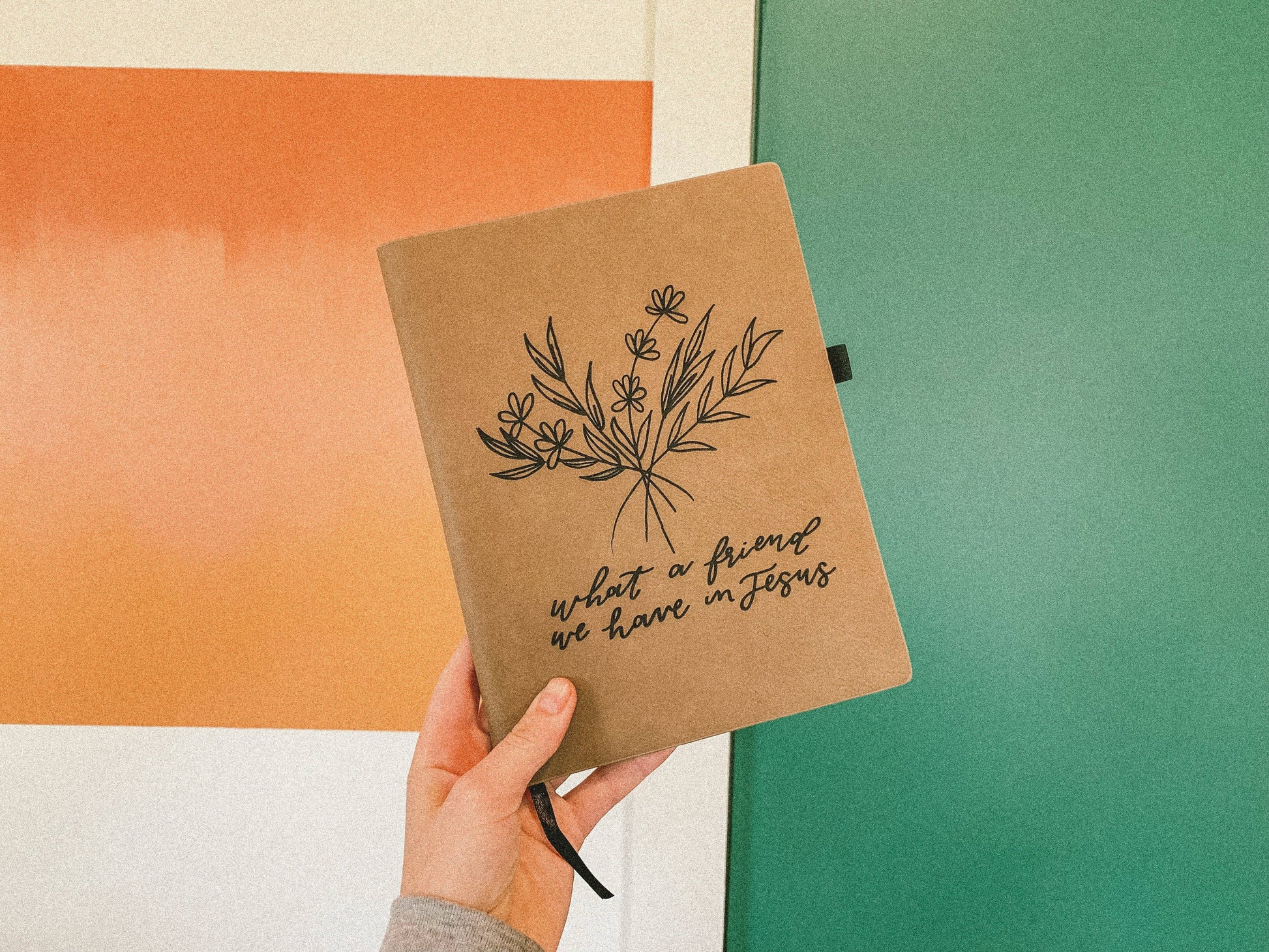 This Leather Engraved Journal for What A Friend We Have in Jesus features 80 lined pages, a 7" x 9" size, and an attached ribbon bookmark. It is available in Buckskin and Chestnut and may have minor variations due to its handmade nature.